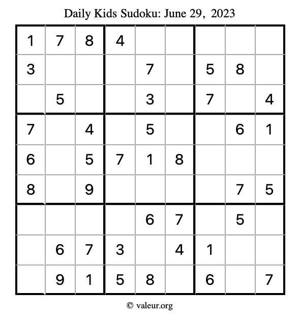 Kids Sudoku June 29, 2023 is not the only sudoku puzzle we have. We create a new kids sudoku puzzle every day for you to print and solve. Check out today's kids sudoku puzzle here!
