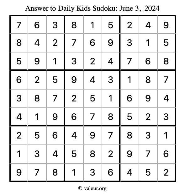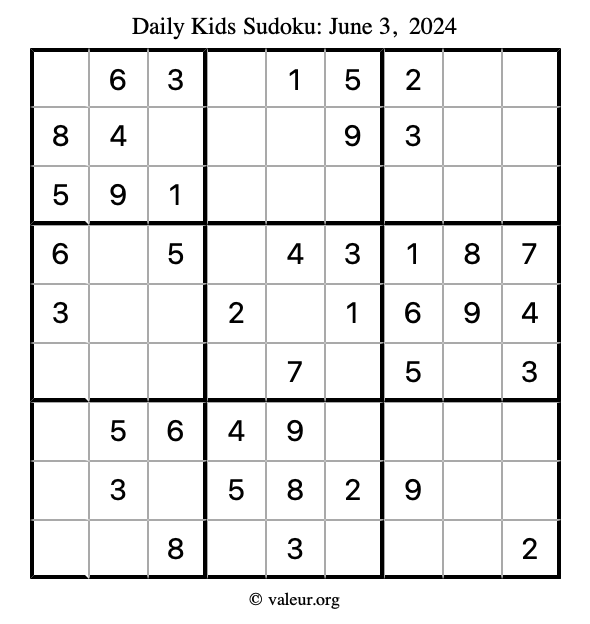 Here is the June 3, 2024 kids sudoku puzzle. You are welcome to print a copy to solve by hand. For your convenience, we have also included the solution further down the page so you can check your work.