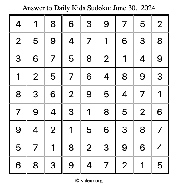 Kids Sudoku June 30, 2024 is not the only sudoku puzzle we have. We create a new kids sudoku puzzle every day for you to print and solve. Check out today's kids sudoku puzzle here!