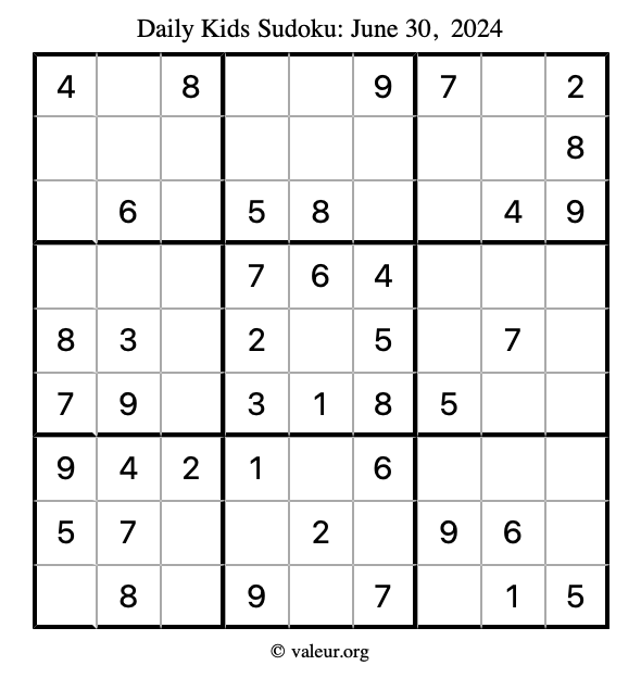 Here is the June 30, 2024 kids sudoku puzzle. You are welcome to print a copy to solve by hand. For your convenience, we have also included the solution further down the page so you can check your work.