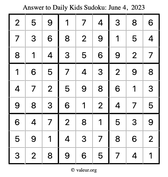 Kids Sudoku June 4, 2023 is not the only sudoku puzzle we have. We create a new kids sudoku puzzle every day for you to print and solve. Check out today's kids sudoku puzzle here!