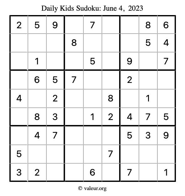 Here is the June 4, 2023 kids sudoku puzzle. You are welcome to print a copy to solve by hand. For your convenience, we have also included the solution further down the page so you can check your work.