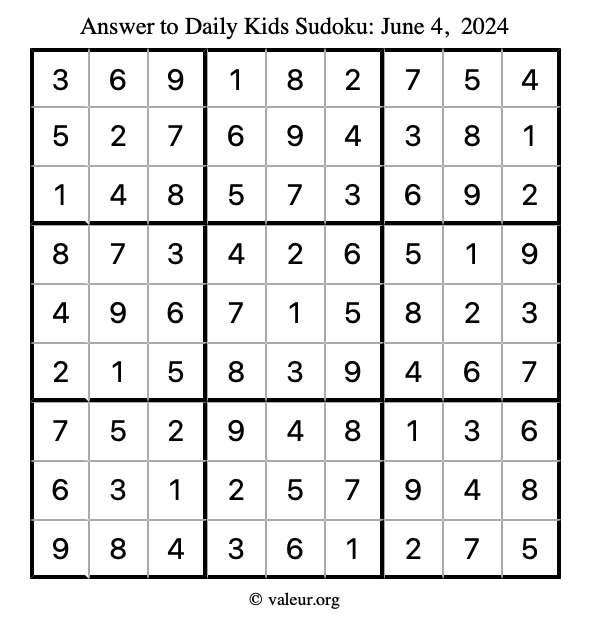 Here is the June 4, 2024 kids sudoku puzzle. You are welcome to print a copy to solve by hand. For your convenience, we have also included the solution further down the page so you can check your work.