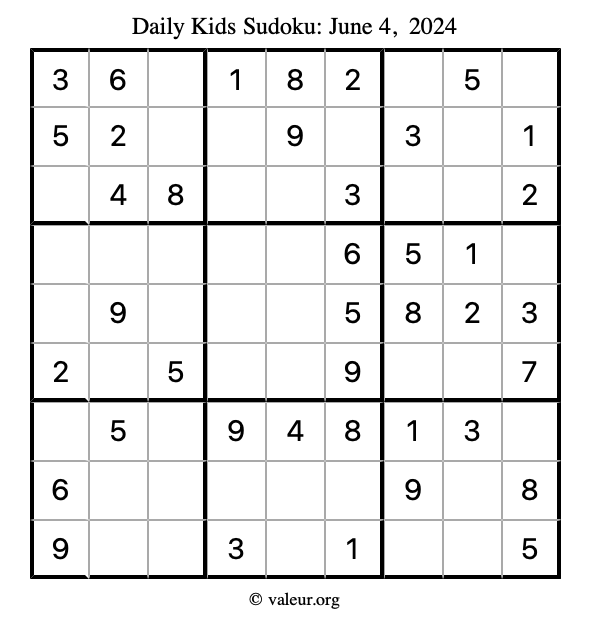 Kids Sudoku June 4, 2024 is not the only sudoku puzzle we have. We create a new kids sudoku puzzle every day for you to print and solve. Check out today's kids sudoku puzzle here!
