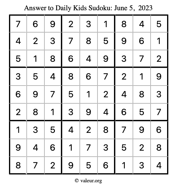 Here is the June 5, 2023 kids sudoku puzzle. You are welcome to print a copy to solve by hand. For your convenience, we have also included the solution further down the page so you can check your work.