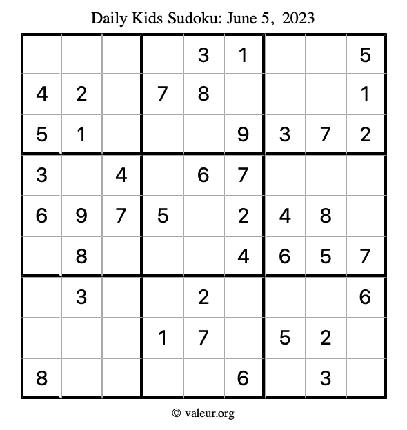 Kids Sudoku June 5, 2023 is not the only sudoku puzzle we have. We create a new kids sudoku puzzle every day for you to print and solve. Check out today's kids sudoku puzzle here!