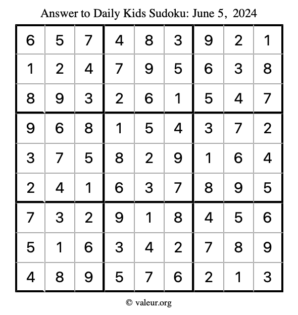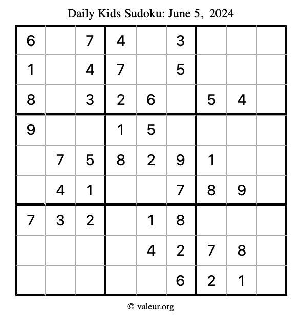 Here is the June 5, 2024 kids sudoku puzzle. You are welcome to print a copy to solve by hand. For your convenience, we have also included the solution further down the page so you can check your work.