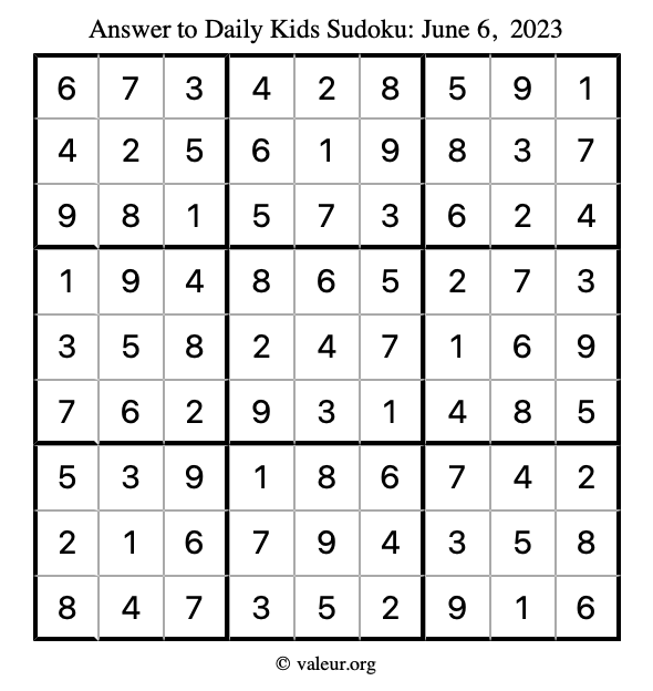 Here is the June 6, 2023 kids sudoku puzzle. You are welcome to print a copy to solve by hand. For your convenience, we have also included the solution further down the page so you can check your work.