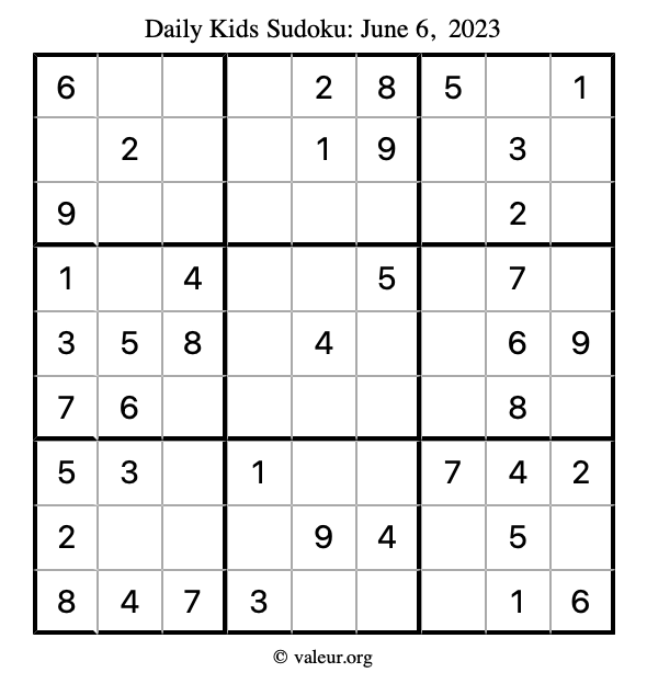 Kids Sudoku June 6, 2023 is not the only sudoku puzzle we have. We create a new kids sudoku puzzle every day for you to print and solve. Check out today's kids sudoku puzzle here!