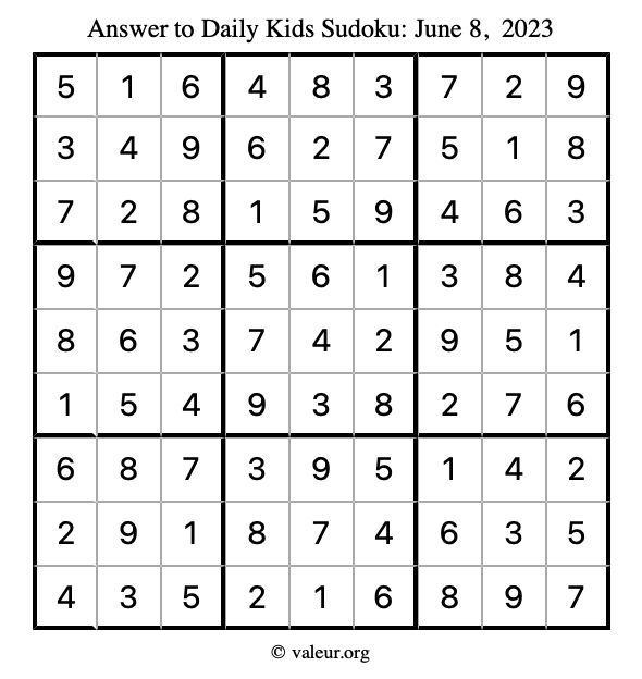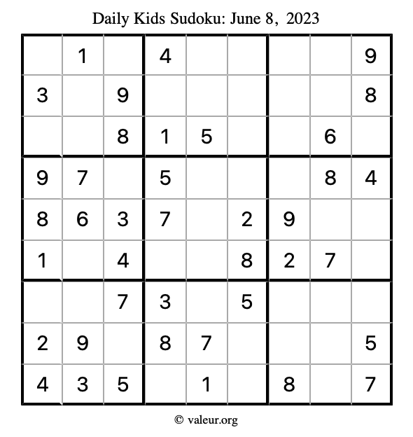 Kids Sudoku June 8, 2023 is not the only sudoku puzzle we have. We create a new kids sudoku puzzle every day for you to print and solve. Check out today's kids sudoku puzzle here!