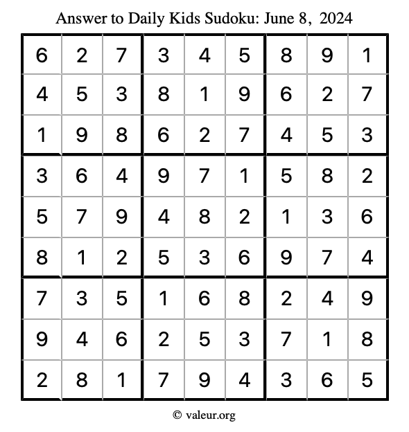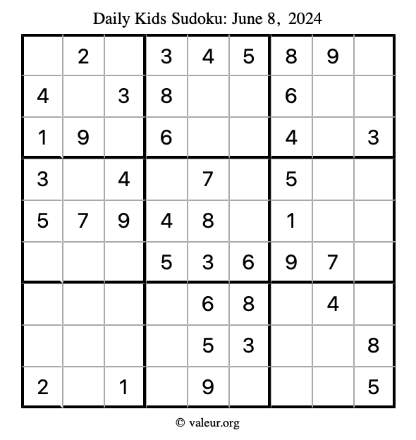 Here is the June 8, 2024 kids sudoku puzzle. You are welcome to print a copy to solve by hand. For your convenience, we have also included the solution further down the page so you can check your work.
