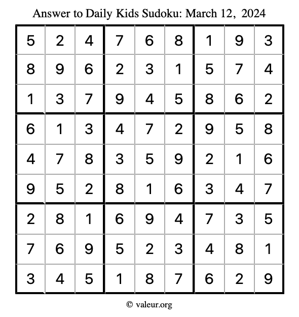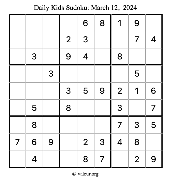 Here is the March 12, 2024 kids sudoku puzzle. You are welcome to print a copy to solve by hand. For your convenience, we have also included the solution further down the page so you can check your work.
