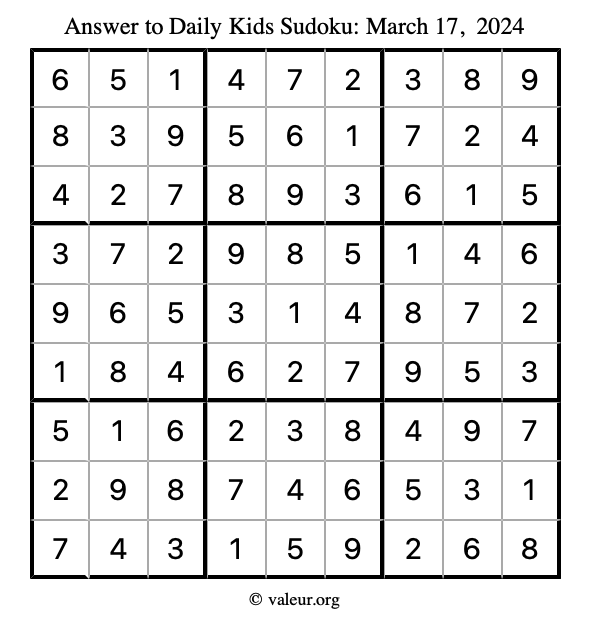 Here is the March 17, 2024 kids sudoku puzzle. You are welcome to print a copy to solve by hand. For your convenience, we have also included the solution further down the page so you can check your work.