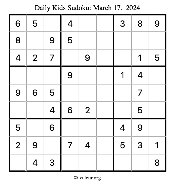Kids Sudoku March 17, 2024 is not the only sudoku puzzle we have. We create a new kids sudoku puzzle every day for you to print and solve. Check out today's kids sudoku puzzle here!