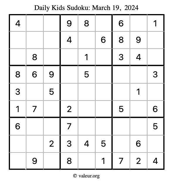 Here is the March 19, 2024 kids sudoku puzzle. You are welcome to print a copy to solve by hand. For your convenience, we have also included the solution further down the page so you can check your work.