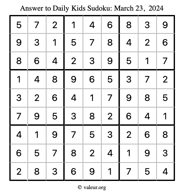 Here is the March 23, 2024 kids sudoku puzzle. You are welcome to print a copy to solve by hand. For your convenience, we have also included the solution further down the page so you can check your work.