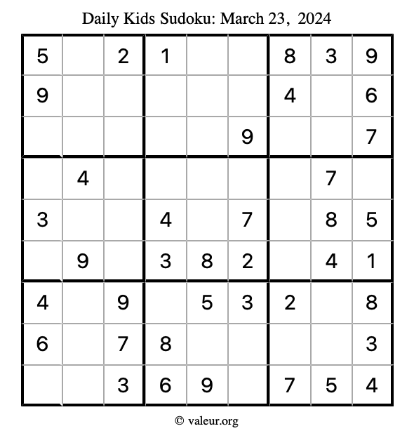 Kids Sudoku March 23, 2024 is not the only sudoku puzzle we have. We create a new kids sudoku puzzle every day for you to print and solve. Check out today's kids sudoku puzzle here!