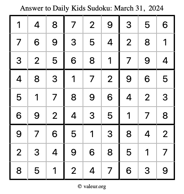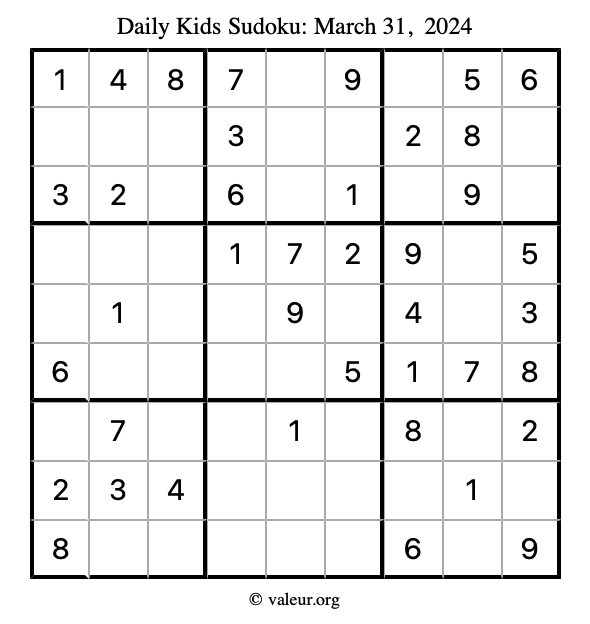 Here is the March 31, 2024 kids sudoku puzzle. You are welcome to print a copy to solve by hand. For your convenience, we have also included the solution further down the page so you can check your work.