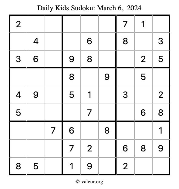Kids Sudoku March 6, 2024 is not the only sudoku puzzle we have. We create a new kids sudoku puzzle every day for you to print and solve. Check out today's kids sudoku puzzle here!
