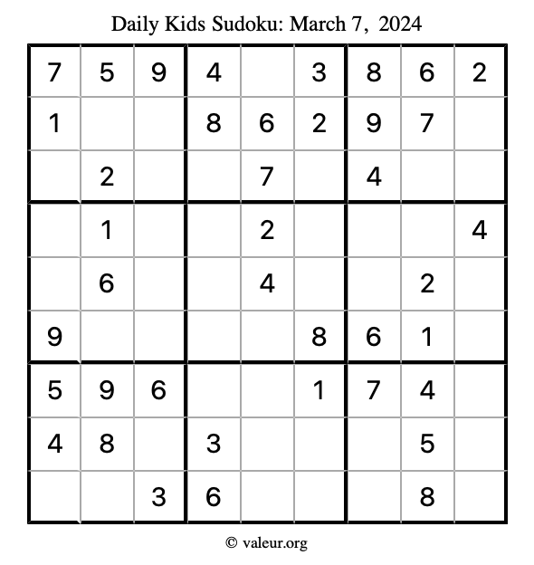 Here is the March 7, 2024 kids sudoku puzzle. You are welcome to print a copy to solve by hand. For your convenience, we have also included the solution further down the page so you can check your work.