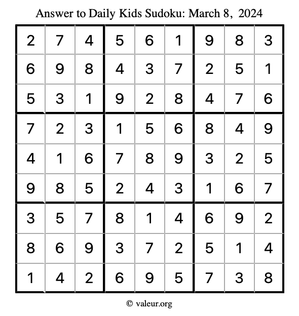 Here is the March 8, 2024 kids sudoku puzzle. You are welcome to print a copy to solve by hand. For your convenience, we have also included the solution further down the page so you can check your work.