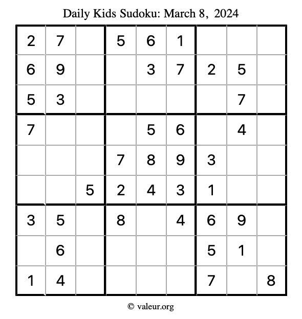 Kids Sudoku March 8, 2024 is not the only sudoku puzzle we have. We create a new kids sudoku puzzle every day for you to print and solve. Check out today's kids sudoku puzzle here!