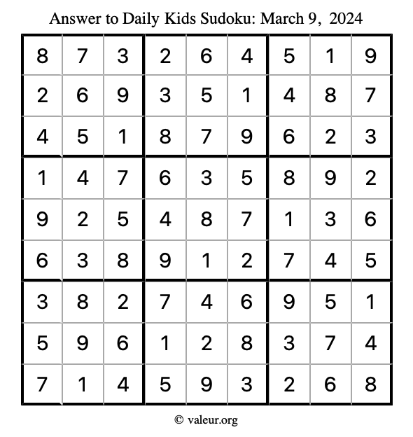 Here is the March 9, 2024 kids sudoku puzzle. You are welcome to print a copy to solve by hand. For your convenience, we have also included the solution further down the page so you can check your work.