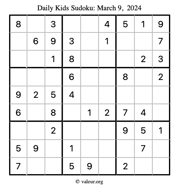 Kids Sudoku March 9, 2024 is not the only sudoku puzzle we have. We create a new kids sudoku puzzle every day for you to print and solve. Check out today's kids sudoku puzzle here!