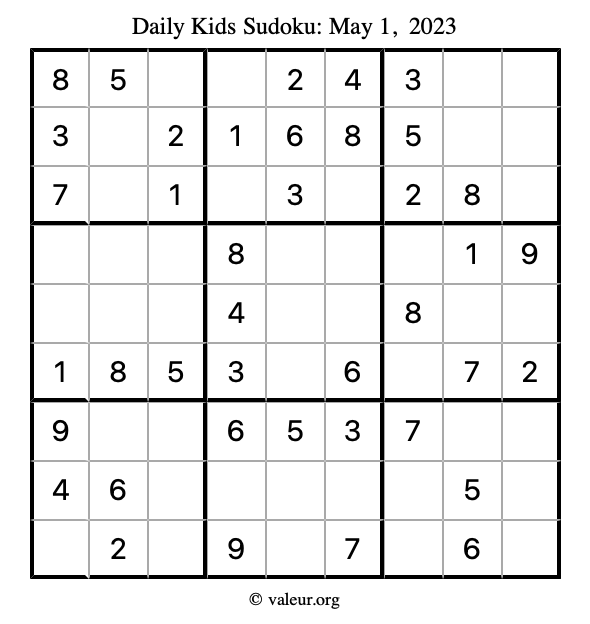 Here is the May 1, 2023 kids sudoku puzzle. You are welcome to print a copy to solve by hand. For your convenience, we have also included the solution further down the page so you can check your work.