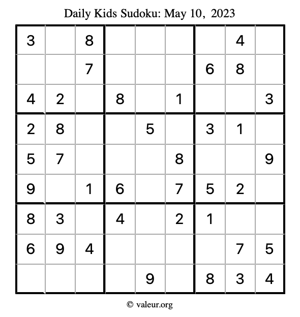 Kids Sudoku May 10, 2023 is not the only sudoku puzzle we have. We create a new kids sudoku puzzle every day for you to print and solve. Check out today's kids sudoku puzzle here!