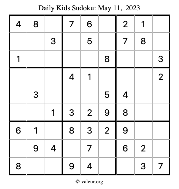 Kids Sudoku May 11, 2023 is not the only sudoku puzzle we have. We create a new kids sudoku puzzle every day for you to print and solve. Check out today's kids sudoku puzzle here!