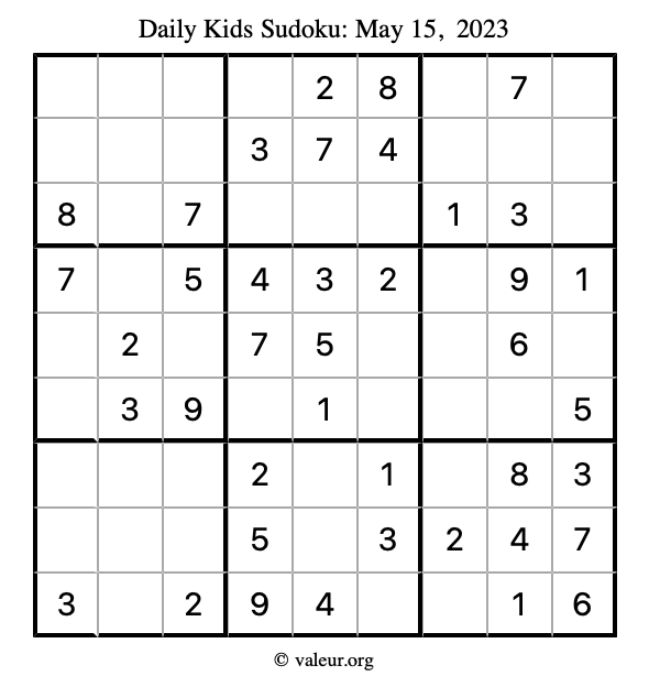 Kids Sudoku May 15, 2023 is not the only sudoku puzzle we have. We create a new kids sudoku puzzle every day for you to print and solve. Check out today's kids sudoku puzzle here!