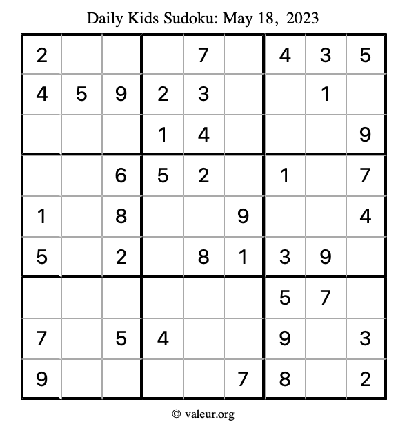 Kids Sudoku May 18, 2023 is not the only sudoku puzzle we have. We create a new kids sudoku puzzle every day for you to print and solve. Check out today's kids sudoku puzzle here!