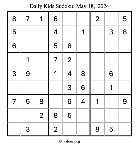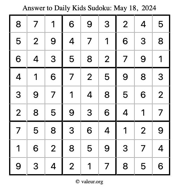 Here is the May 18, 2024 kids sudoku puzzle. You are welcome to print a copy to solve by hand. For your convenience, we have also included the solution further down the page so you can check your work.
