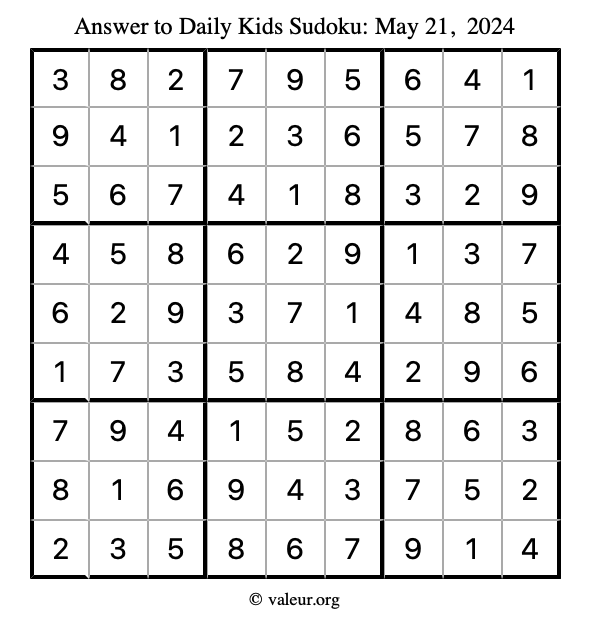 Here is the May 21, 2024 kids sudoku puzzle. You are welcome to print a copy to solve by hand. For your convenience, we have also included the solution further down the page so you can check your work.