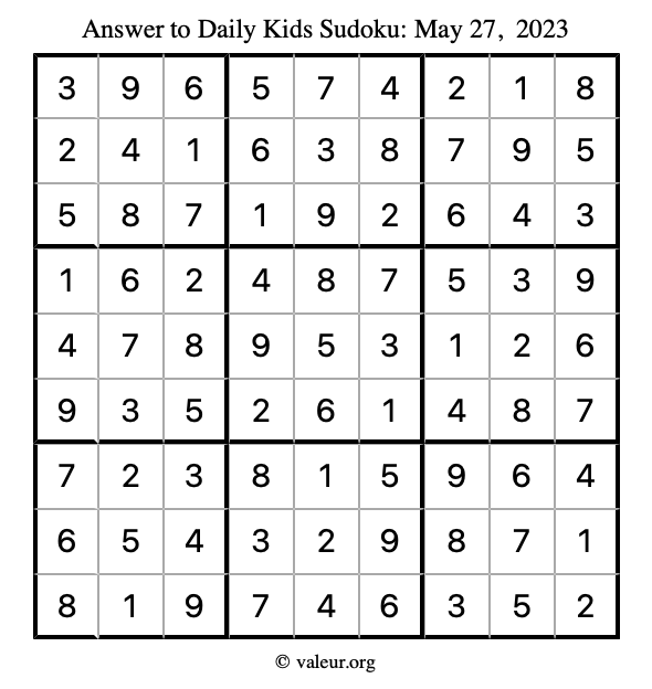 Here is the May 27, 2023 kids sudoku puzzle. You are welcome to print a copy to solve by hand. For your convenience, we have also included the solution further down the page so you can check your work.