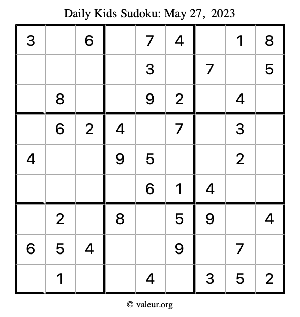 Kids Sudoku May 27, 2023 is not the only sudoku puzzle we have. We create a new kids sudoku puzzle every day for you to print and solve. Check out today's kids sudoku puzzle here!