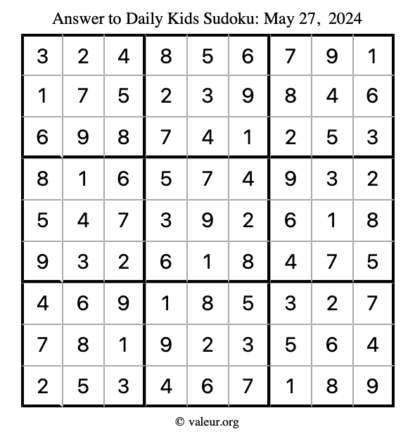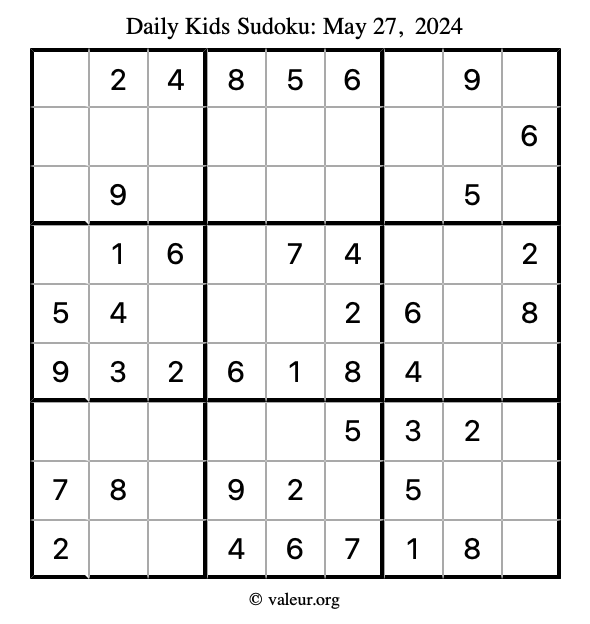 Here is the May 27, 2024 kids sudoku puzzle. You are welcome to print a copy to solve by hand. For your convenience, we have also included the solution further down the page so you can check your work.
