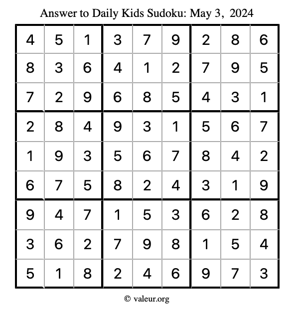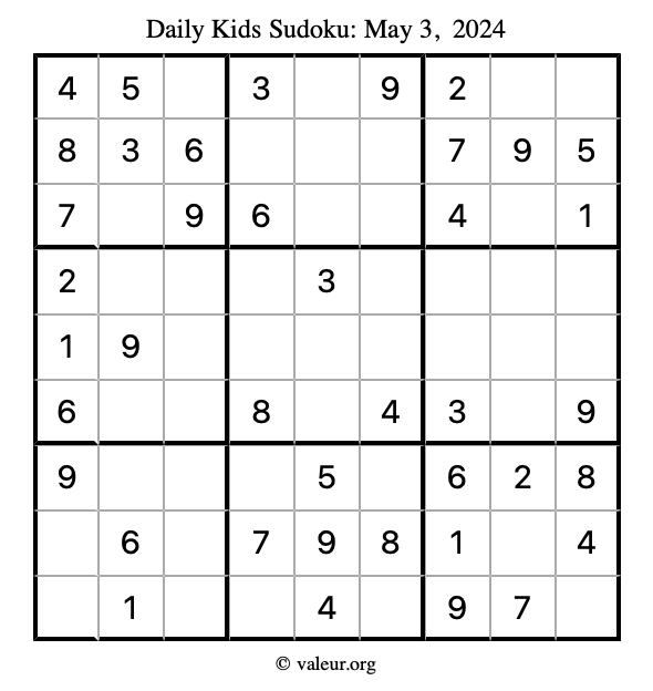 Here is the May 3, 2024 kids sudoku puzzle. You are welcome to print a copy to solve by hand. For your convenience, we have also included the solution further down the page so you can check your work.