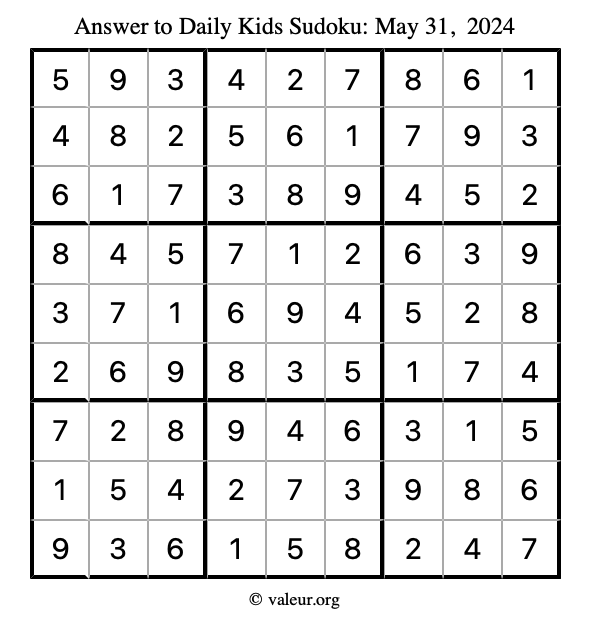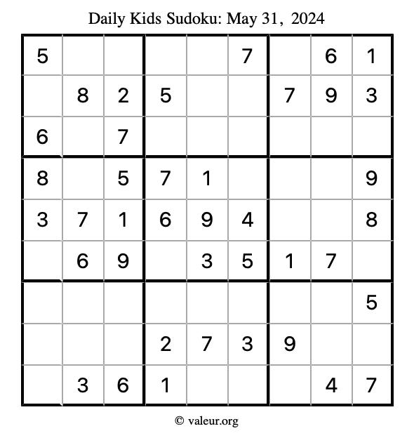 Here is the May 31, 2024 kids sudoku puzzle. You are welcome to print a copy to solve by hand. For your convenience, we have also included the solution further down the page so you can check your work.
