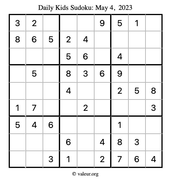 Here is the May 4, 2023 kids sudoku puzzle. You are welcome to print a copy to solve by hand. For your convenience, we have also included the solution further down the page so you can check your work.