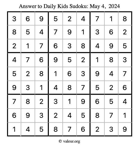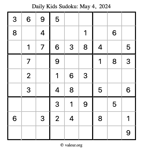 Here is the May 4, 2024 kids sudoku puzzle. You are welcome to print a copy to solve by hand. For your convenience, we have also included the solution further down the page so you can check your work.