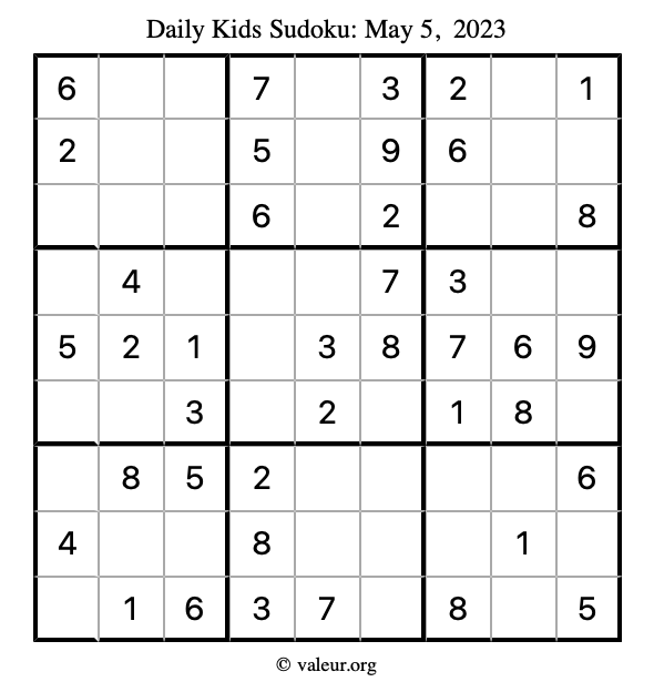 Kids Sudoku May 5, 2023 is not the only sudoku puzzle we have. We create a new kids sudoku puzzle every day for you to print and solve. Check out today's kids sudoku puzzle here!