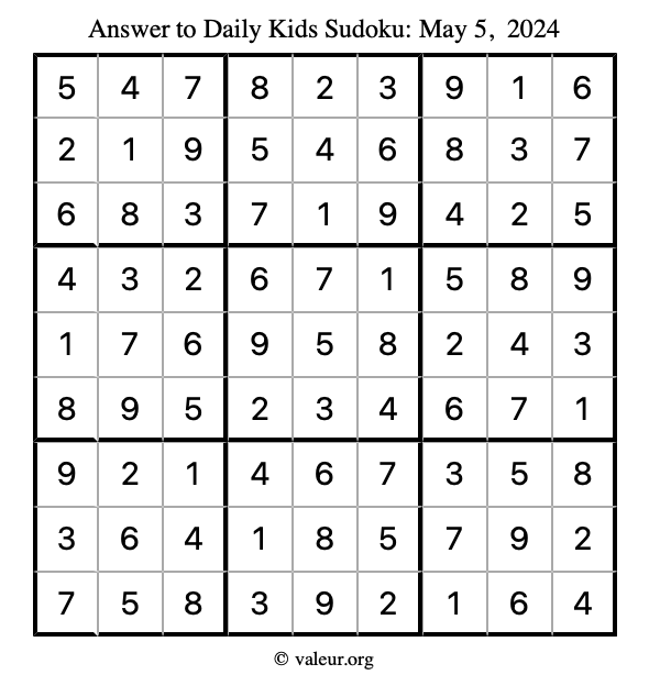 Here is the May 5, 2024 kids sudoku puzzle. You are welcome to print a copy to solve by hand. For your convenience, we have also included the solution further down the page so you can check your work.