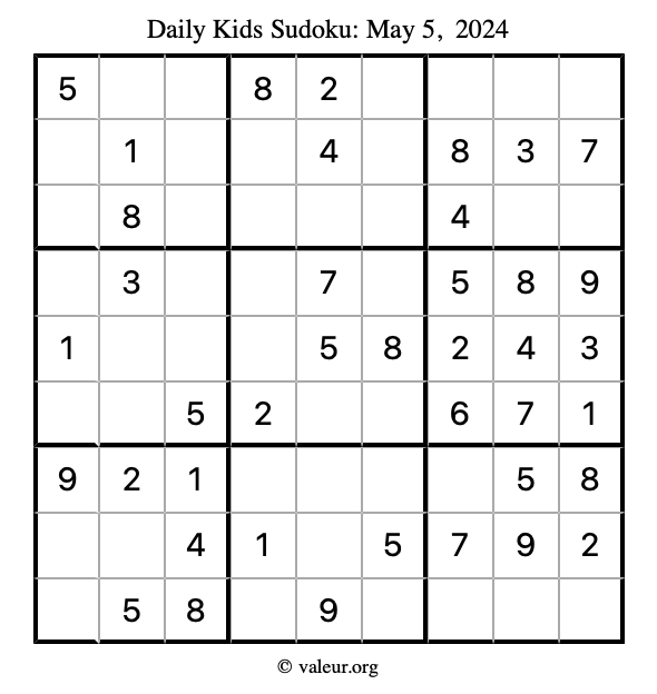 Kids Sudoku May 5, 2024 is not the only sudoku puzzle we have. We create a new kids sudoku puzzle every day for you to print and solve. Check out today's kids sudoku puzzle here!