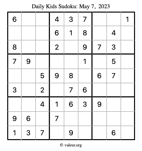 Here is the May 7, 2023 kids sudoku puzzle. You are welcome to print a copy to solve by hand. For your convenience, we have also included the solution further down the page so you can check your work.