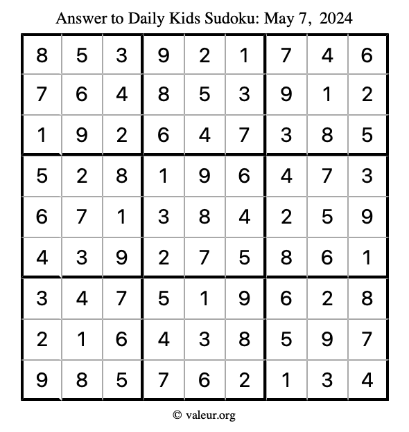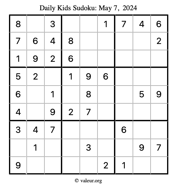 Here is the May 7, 2024 kids sudoku puzzle. You are welcome to print a copy to solve by hand. For your convenience, we have also included the solution further down the page so you can check your work.