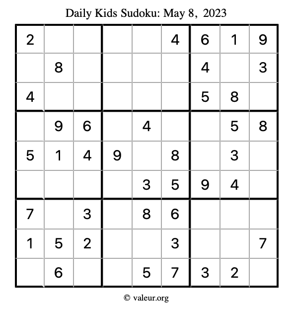 Here is the May 8, 2023 kids sudoku puzzle. You are welcome to print a copy to solve by hand. For your convenience, we have also included the solution further down the page so you can check your work.