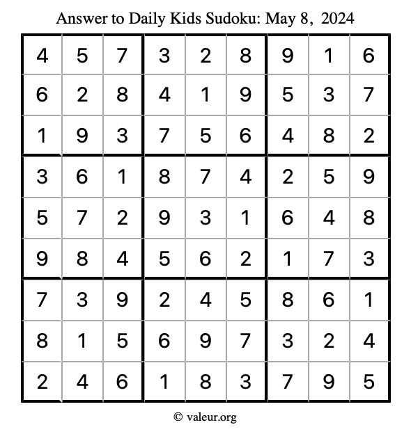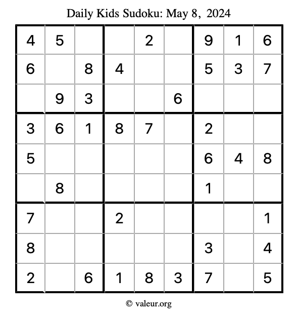 Here is the May 8, 2024 kids sudoku puzzle. You are welcome to print a copy to solve by hand. For your convenience, we have also included the solution further down the page so you can check your work.