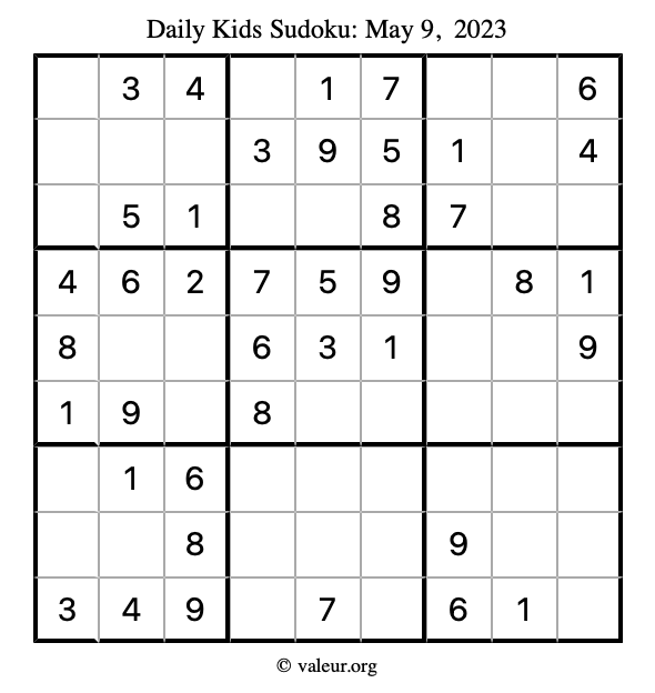Kids Sudoku May 9, 2023 is not the only sudoku puzzle we have. We create a new kids sudoku puzzle every day for you to print and solve. Check out today's kids sudoku puzzle here!